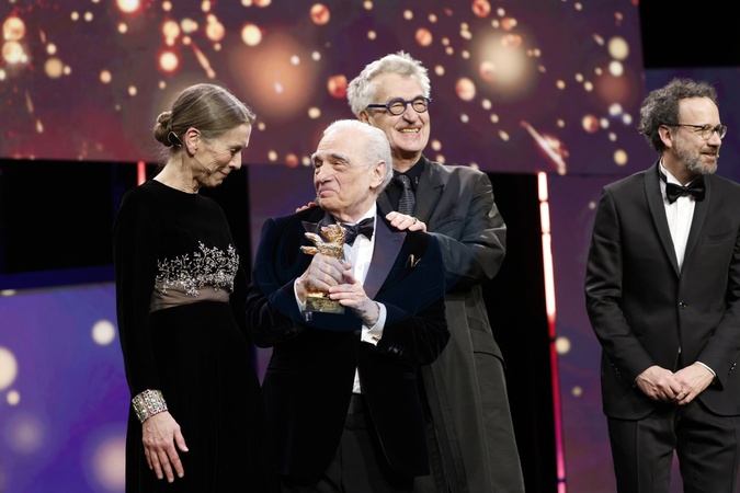 Mariette Rissenbeek, Wim Wenders, Martin Scorsese, Carlo Chatrian on stage at the Honorary Golden Bear Award Ceremony for Martin Scorsese during the 74th Berlinale International Film Festival at Berlinale Palace on February 20, 2024 in Berlin, Germany., Credit:John Rasimus / Avalon