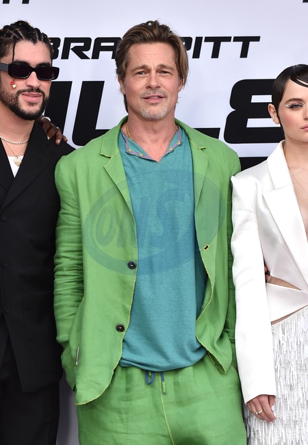 Bad Bunny, Brad Pitt and Joey King arriving to the Los Angeles premiere of "Bullet Train" held at the Regency Village Theatre in Westwood, CA on August 1, 2022.© OConnor / AFF-USA.com