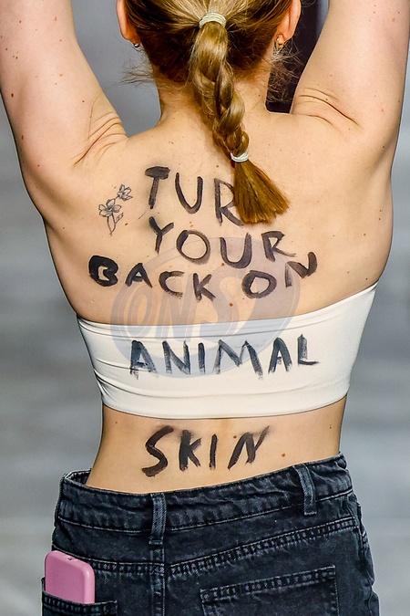 Manifestante pour les droits des animaux - Défilé Fendi mode femme automne / hiver 2024-2025 lors de la Fashion Week de Milan (MFW), à Milanb, Italie, le 21 février 2024. Fendi fashion show during the Milan Fashion Week Womenswear Fall/Winter 2024-2025 on February 21, 2024 in Milan, Italy.
