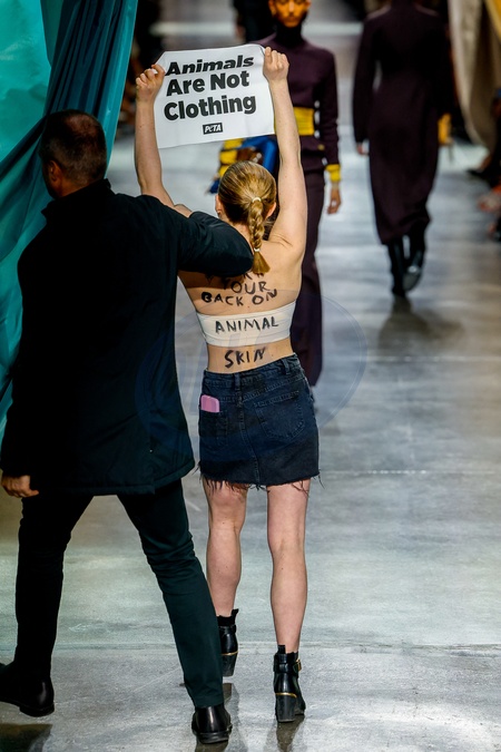 Manifestante pour les droits des animaux - Défilé Fendi mode femme automne / hiver 2024-2025 lors de la Fashion Week de Milan (MFW), à Milanb, Italie, le 21 février 2024. Fendi fashion show during the Milan Fashion Week Womenswear Fall/Winter 2024-2025 on February 21, 2024 in Milan, Italy.