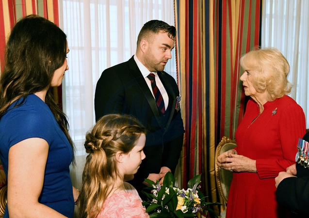 London, UK, 21 February 2024: Queen Camilla talks with Sgt (retired) Carl Shadrake and family, as she meets fund members and beneficiaries during The Colonel's Fund event at Clarence House in London., Credit:John Stillwell / Avalon