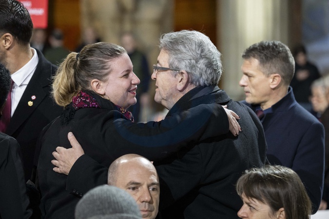 Mathilde Panot et Jean-Luc Mélenchon lors de la cérémonie d'État pour l'intronisation de Missak Manouchian et de sa femme Mélinee au Panthéon à Paris le 21 février 2024. © Eliot Blondet / Pool / Bestimage French left-wing party La France Insoumise (LFI) leader Jean-Luc Melenchon and MPs Mathilde Panot during a state ceremony for Missak and Melinee Manouchian's induction into The Pantheon in Paris on February 21, 2024.