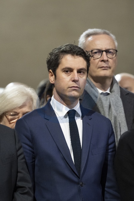 Le premier ministre Gabriel Attal et Bruno Le Maire lors de la cérémonie d'État pour l'intronisation de Missak Manouchian et de sa femme Mélinee au Panthéon à Paris le 21 février 2024. © Eliot Blondet / Pool / Bestimage French Prime Minister Gabriel Attal during a state ceremony for Missak and Melinee Manouchian's induction into The Pantheon in Paris on February 21, 2024.