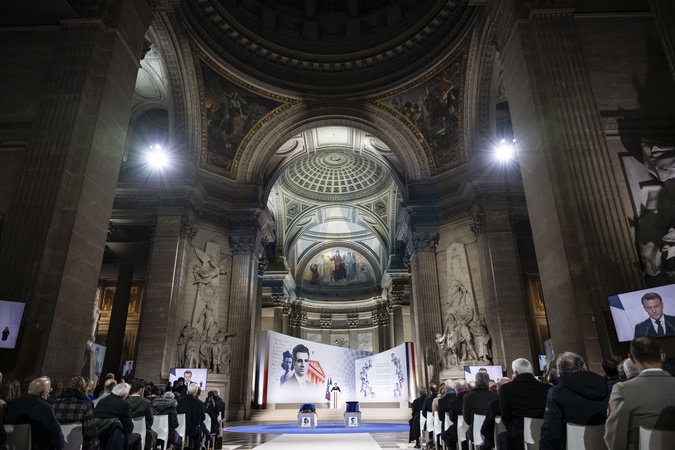 Illustration lors de la cérémonie d'État pour l'intronisation de Missak Manouchian et de sa femme Mélinee au Panthéon à Paris le 21 février 2024. © Eliot Blondet / Pool / Bestimage French President Emmanuel Macron gives a speech during the national tribute to the Armenian communist resistance fighter and his comrades at the Pantheon, in Paris on February 21, 2024.