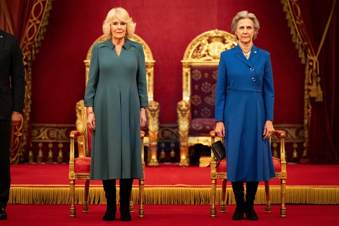 Queen Camilla (left) stands with the Duchess of Gloucester, during an event to present the Queen's Anniversary Prizes for Higher and Further Education, at Buckingham Palace in London. Picture date: Thursday February 22, 2024. NO UK USE FOR 48 HOURS, Credit:Avalon.red / Avalon