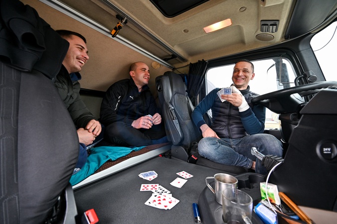 LVIV REGION, UKRAINE - FEBRUARY 22, 2024 - Drivers share a laugh while playing cards in the cabin as trucks of Ukrainian carriers remain blocked at the Shehyni crossing on the Ukraine-Poland border, Lviv region, western Ukraine., Credit:Anastasiia Smolienko / Avalon