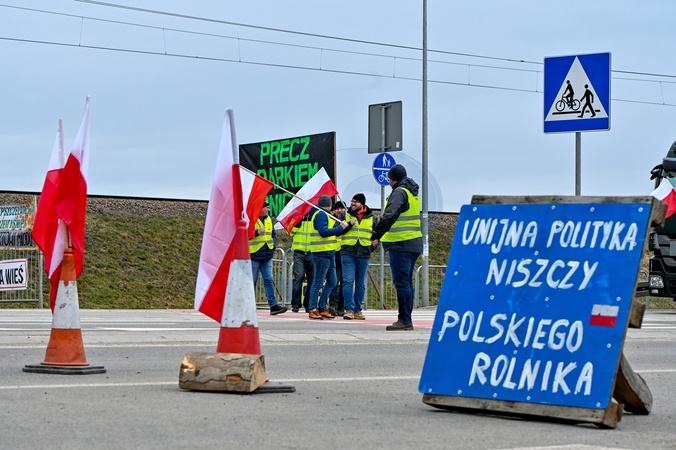 LVIV REGION, UKRAINE - FEBRUARY 22, 2024 - Polish demonstrators carry national flags as they block the traffic of Ukrainian trucks at the Shehyni-Medyka border crossing on the Ukraine-Poland border, Lviv region, western Ukraine., Credit:Anastasiia Smolienko / Avalon