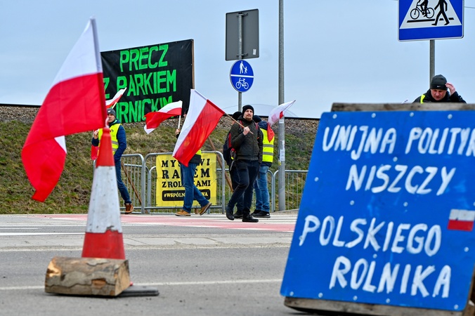 LVIV REGION, UKRAINE - FEBRUARY 22, 2024 - Polish demonstrators carry national flags as they block the traffic of Ukrainian trucks at the Shehyni-Medyka border crossing on the Ukraine-Poland border, Lviv region, western Ukraine., Credit:Anastasiia Smolienko / Avalon