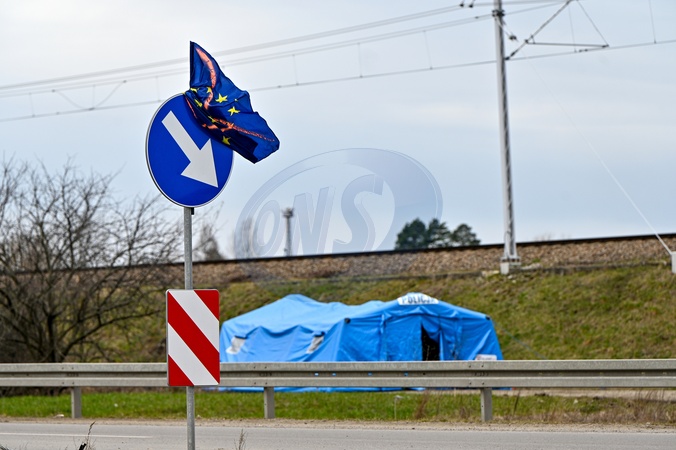 LVIV REGION, UKRAINE - FEBRUARY 22, 2024 - An EU flag is pictured as Polish demonstrators block the traffic of Ukrainian trucks at the Shehyni-Medyka border crossing on the Ukraine-Poland border, Lviv region, western Ukraine., Credit:Anastasiia Smolienko / Avalon