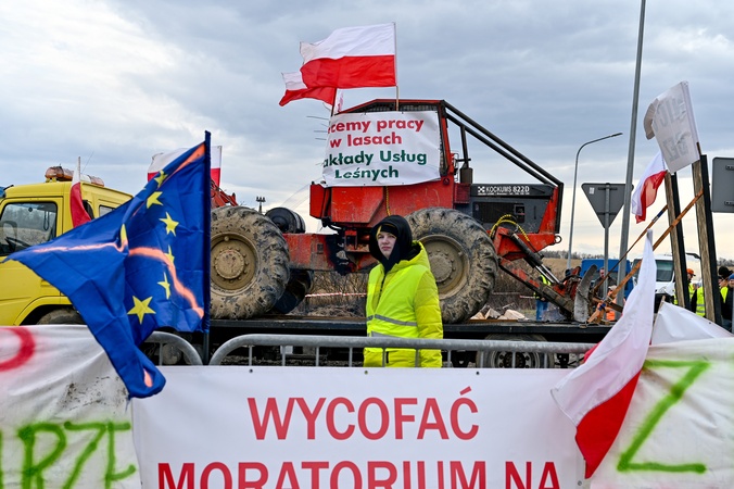 LVIV REGION, UKRAINE - FEBRUARY 22, 2024 - A Polish demonstrator partakes in the blockade of the traffic of Ukrainian trucks at the Shehyni-Medyka border crossing on the Ukraine-Poland border, Lviv region, western Ukraine., Credit:Anastasiia Smolienko / Avalon