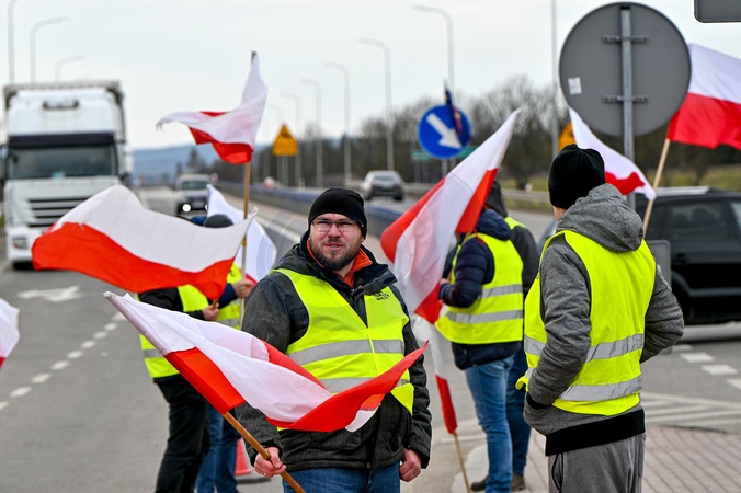 LVIV REGION, UKRAINE - FEBRUARY 22, 2024 - Polish demonstrators carry national flags as they block the traffic of Ukrainian trucks at the Shehyni-Medyka border crossing on the Ukraine-Poland border, Lviv region, western Ukraine., Credit:Anastasiia Smolienko / Avalon