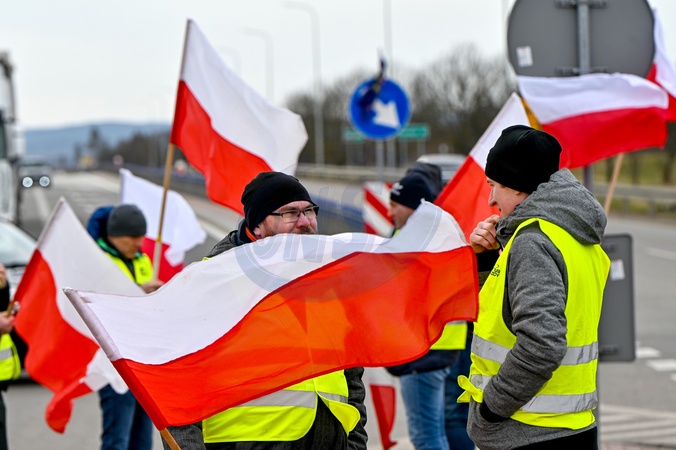 LVIV REGION, UKRAINE - FEBRUARY 22, 2024 - Polish demonstrators carry national flags as they block the traffic of Ukrainian trucks at the Shehyni-Medyka border crossing on the Ukraine-Poland border, Lviv region, western Ukraine., Credit:Anastasiia Smolienko / Avalon