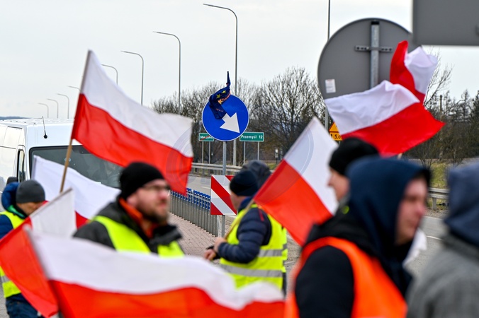 LVIV REGION, UKRAINE - FEBRUARY 22, 2024 - Polish demonstrators carry national flags as they block the traffic of Ukrainian trucks at the Shehyni-Medyka border crossing on the Ukraine-Poland border, Lviv region, western Ukraine., Credit:Anastasiia Smolienko / Avalon