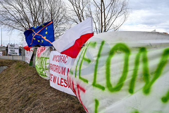 LVIV REGION, UKRAINE - FEBRUARY 22, 2024 - The flags of EU and Poland are pictured as Polish demonstrators block the traffic of Ukrainian trucks at the Shehyni-Medyka border crossing on the Ukraine-Poland border, Lviv region, western Ukraine., Credit:Anastasiia Smolienko / Avalon