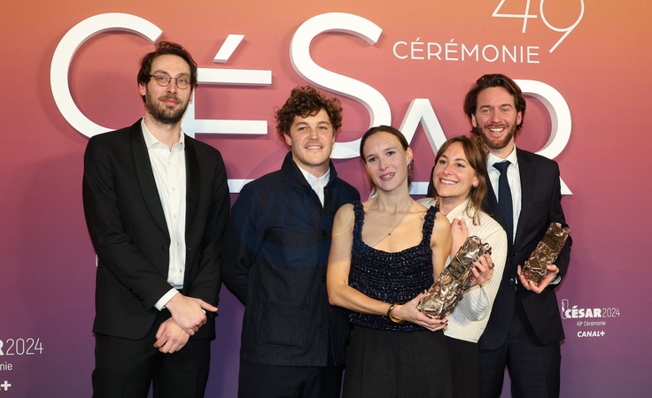 Simon Ingelaere, Thibault de Gantès, Mathilde Bédouet, Ninon Chapuis et Lucas Le Postec (César du meilleur film de court-métrage d'animation pour "Été 96 ") - Photocall des lauréats (press room) lors de la 49ème édition de la cérémonie des César à l'Olympia à Paris le 23 février 2024 © Dominique Jacovides / Olivier Borde / Bestimage Press room during 49th Cesar Film Awards at L'Olympia on February 23, 2024 in Paris