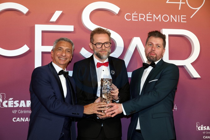 Bruno Sommier, Cyrille Bonjean et Jean-Louis Autret (César des meilleurs effets visuels pour «Le Règne Animal») - Photocall des lauréats (press room) lors de la 49ème édition de la cérémonie des César à l'Olympia à Paris le 23 février 2024 © Dominique Jacovides / Olivier Borde / Bestimage Press room during 49th Cesar Film Awards at L'Olympia on February 23, 2024 in Paris