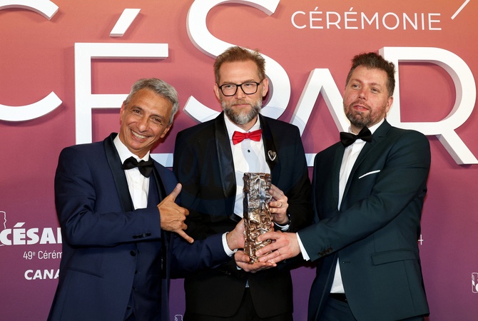 Bruno Sommier, Cyrille Bonjean et Jean-Louis Autret (César des meilleurs effets visuels pour «Le Règne Animal») - Photocall des lauréats (press room) lors de la 49ème édition de la cérémonie des César à l'Olympia à Paris le 23 février 2024 © Dominique Jacovides / Olivier Borde / Bestimage Press room during 49th Cesar Film Awards at L'Olympia on February 23, 2024 in Paris