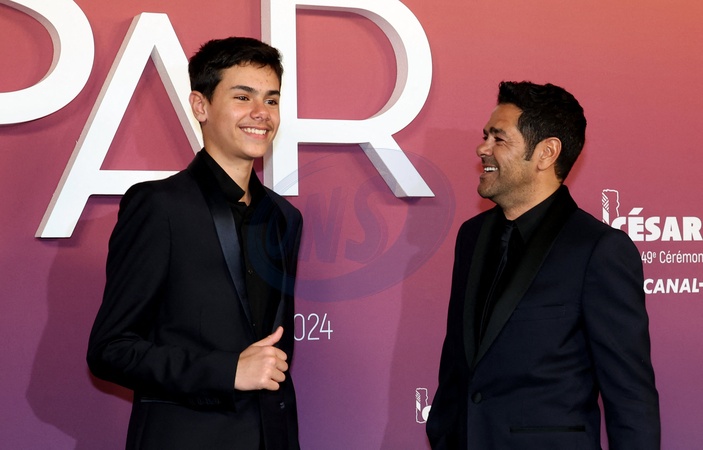 Jamel Debbouze et son fils Léon - Photocall des lauréats (press room) lors de la 49ème édition de la cérémonie des César à l'Olympia à Paris le 23 février 2024 © Dominique Jacovides / Olivier Borde / Bestimage Press room during 49th Cesar Film Awards at L'Olympia on February 23, 2024 in Paris