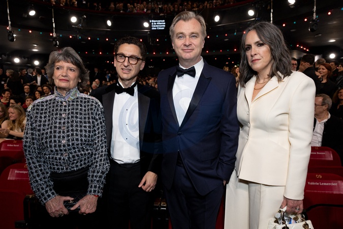 Véronique Cayla, présidente de l'académie des César, Maxima Saada, Christopher Nolan et sa femme Emma Thomas - 49ème édition de la cérémonie des César à l'Olympia à Paris le 23 février 2024 © Dominique Jacovides / Olivier Borde / Bestimage 49th Cesar Film Awards at L'Olympia on February 23, 2024 in Paris