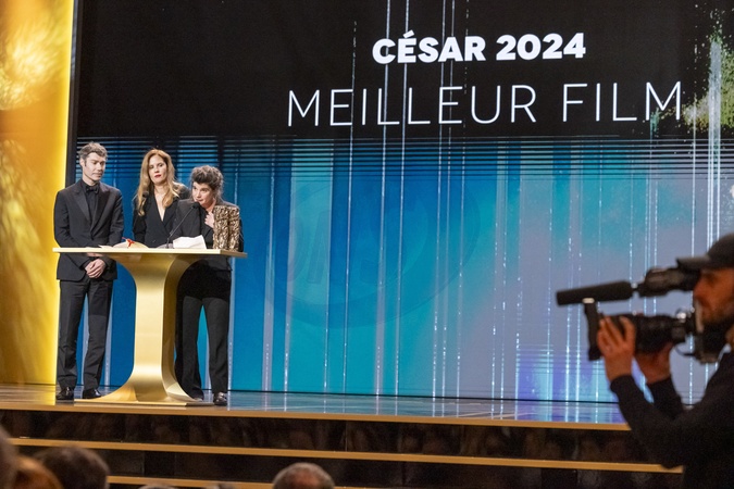 David Thion, Justine Triet et Marie-Ange Luciani (César du meilleur film Pour «Anatomie D'une Chute») - 49ème édition de la cérémonie des César à l'Olympia à Paris le 23 février 2024 © Dominique Jacovides / Olivier Borde / Bestimage 49th Cesar Film Awards at L'Olympia on February 23, 2024 in Paris