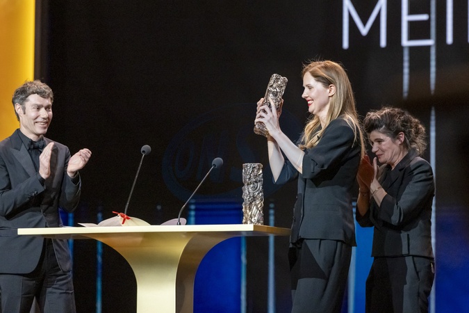 David Thion, Justine Triet et Marie-Ange Luciani (César du meilleur film Pour «Anatomie D'une Chute») - 49ème édition de la cérémonie des César à l'Olympia à Paris le 23 février 2024 © Dominique Jacovides / Olivier Borde / Bestimage 49th Cesar Film Awards at L'Olympia on February 23, 2024 in Paris