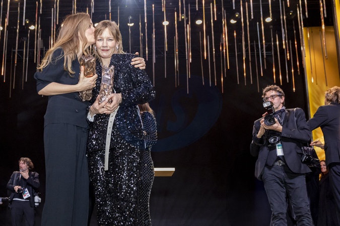 Sandra Hüller, César de la meilleure actrice pour Anatomie d'une chute” et Justine Triet, César de la meilleur réalisation Pour "Anatomie D'une Chute”, César du meilleur scénario original Pour "Anatomie D'une Chute”, César du meilleur film Pour "Anatomie D'une Chute” - 49ème édition de la cérémonie des César à l'Olympia à Paris le 23 février 2024 © Dominique Jacovides / Olivier Borde / Bestimage 49th Cesar Film Awards at L'Olympia on February 23, 2024 in Paris