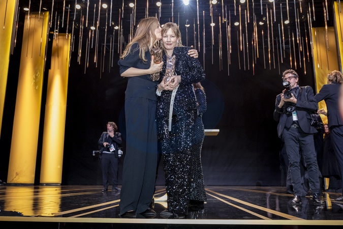 Sandra Hüller, César de la meilleure actrice pour Anatomie d'une chute” et Justine Triet, César de la meilleur réalisation Pour "Anatomie D'une Chute”, César du meilleur scénario original Pour "Anatomie D'une Chute”, César du meilleur film Pour "Anatomie D'une Chute” - 49ème édition de la cérémonie des César à l'Olympia à Paris le 23 février 2024 © Dominique Jacovides / Olivier Borde / Bestimage 49th Cesar Film Awards at L'Olympia on February 23, 2024 in Paris