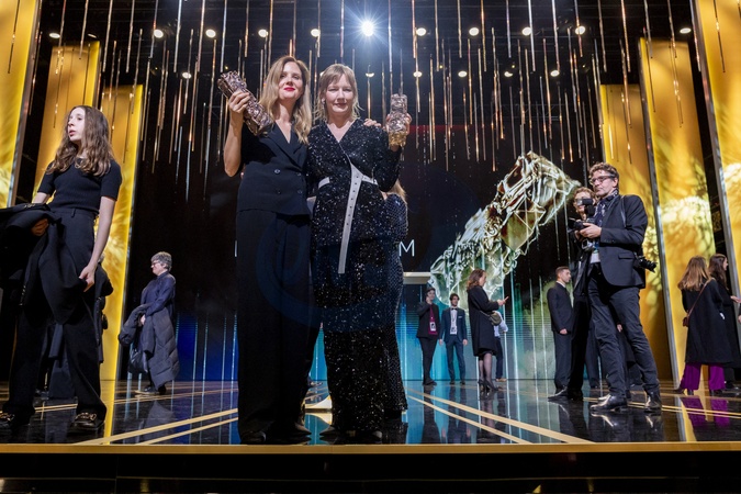 Sandra Hüller, César de la meilleure actrice pour Anatomie d'une chute” et Justine Triet, César de la meilleur réalisation Pour "Anatomie D'une Chute”, César du meilleur scénario original Pour "Anatomie D'une Chute”, César du meilleur film Pour "Anatomie D'une Chute” - 49ème édition de la cérémonie des César à l'Olympia à Paris le 23 février 2024 © Dominique Jacovides / Olivier Borde / Bestimage 49th Cesar Film Awards at L'Olympia on February 23, 2024 in Paris