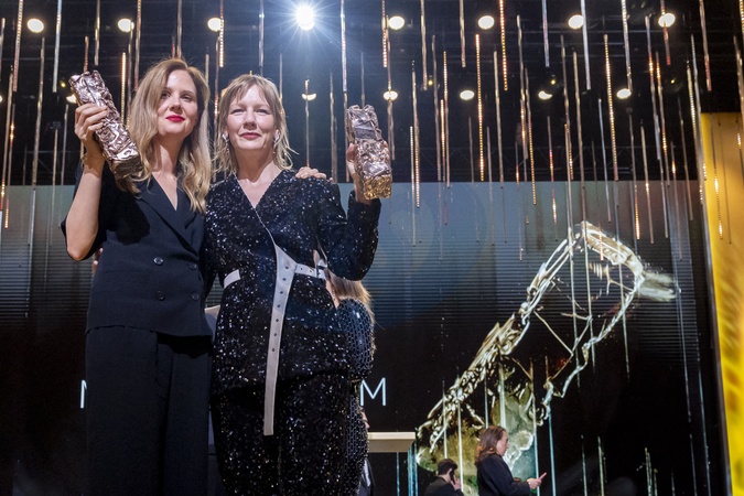 Sandra Hüller, César de la meilleure actrice pour Anatomie d'une chute” et Justine Triet, César de la meilleur réalisation Pour "Anatomie D'une Chute”, César du meilleur scénario original Pour "Anatomie D'une Chute”, César du meilleur film Pour "Anatomie D'une Chute” - 49ème édition de la cérémonie des César à l'Olympia à Paris le 23 février 2024 © Dominique Jacovides / Olivier Borde / Bestimage 49th Cesar Film Awards at L'Olympia on February 23, 2024 in Paris