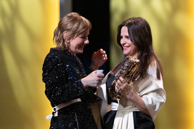 Sandra Hüller, César de la meilleure actrice pour Anatomie d'une chute” et Juliette Binoche - 49ème édition de la cérémonie des César à l'Olympia à Paris le 23 février 2024 © Dominique Jacovides / Olivier Borde / Bestimage 49th Cesar Film Awards at L'Olympia on February 23, 2024 in Paris