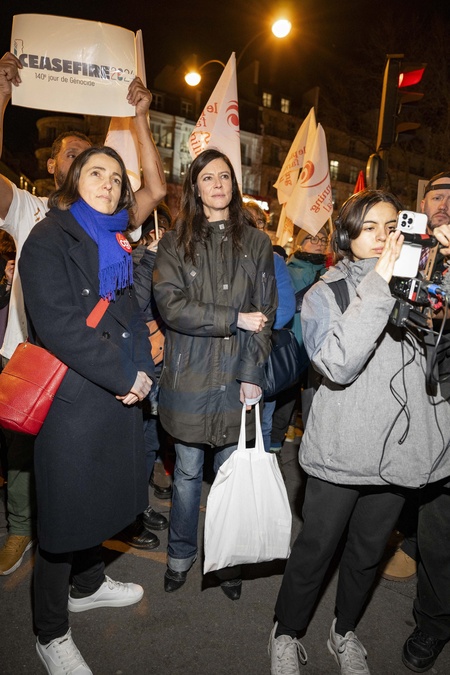Sophie Binet (secrétaire générale CGT) et Anna Mouglalis - Rassemblement en face de l'Olympia à initiative de la CGT spectacle à l'occasion de la 49ème édition de la cérémonie des César 2024 contre les violences sexistes et sexuelles dans le monde du cinéma, suite aux différentes prises de paroles. Paris le 23 février 2024. © Pierre Perusseau / Bestimage Rally in front of the Olympia at the initiative of the CGT spectacle on the occasion of the 49th edition of the César 2024 ceremony against sexist and sexual violence in the world of cinema, following the various speeches. Paris on February 23, 2024.