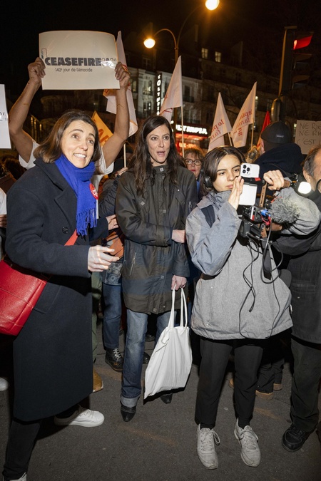 Sophie Binet (secrétaire générale CGT) et Anna Mouglalis - Rassemblement en face de l'Olympia à initiative de la CGT spectacle à l'occasion de la 49ème édition de la cérémonie des César 2024 contre les violences sexistes et sexuelles dans le monde du cinéma, suite aux différentes prises de paroles. Paris le 23 février 2024. © Pierre Perusseau / Bestimage Rally in front of the Olympia at the initiative of the CGT spectacle on the occasion of the 49th edition of the César 2024 ceremony against sexist and sexual violence in the world of cinema, following the various speeches. Paris on February 23, 2024.