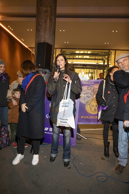 Rassemblement en face de l'Olympia à l’occasion de la 49ème édition de la cérémonie des César 2024 contre les violences sexistes et sexuelles dans le monde du cinéma, suite aux différentes prises de paroles.