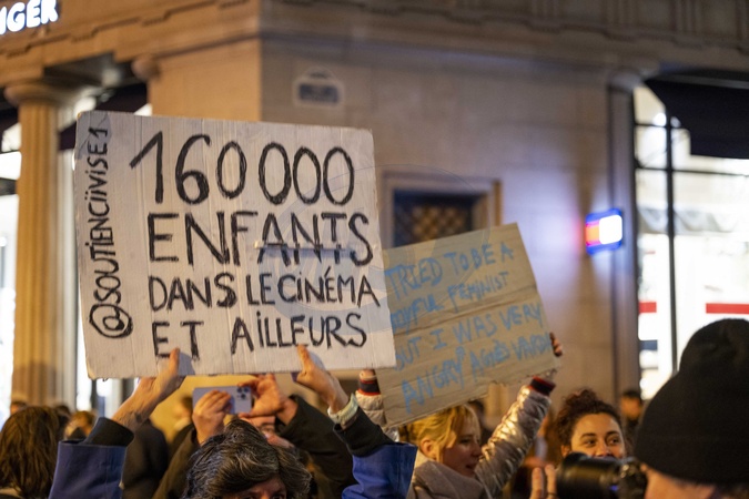 Rassemblement en face de l'Olympia à l’occasion de la 49ème édition de la cérémonie des César 2024 contre les violences sexistes et sexuelles dans le monde du cinéma, suite aux différentes prises de paroles.