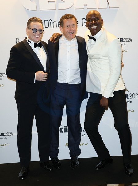 Benoit Magimel, Dany Boon et Jean-Pascal Zadi - Photocall de la 49ème édition de la cérémonie des César au Fouquet's à Paris Le 23 fevrier 2024 © Coadic Guirec / Bestimage