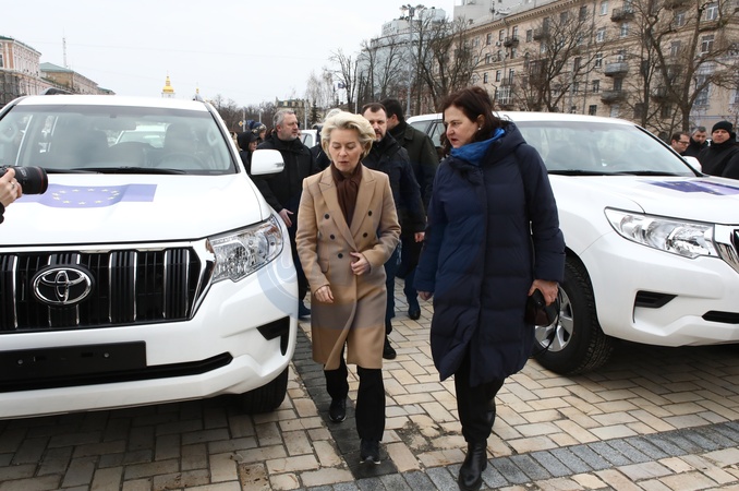 KYIV, UKRAINE - FEBRUARY 24, 2024 - President of the European Commission Ursula von der Leyen (L) and Ambassador of the European Union to Ukraine Katarina Mathernova are pictured during the ceremony to convey combat cars to the front line in Sofiiska Square, Kyiv, capital of Ukraine., Credit:Volodymyr Tarasov / Avalon