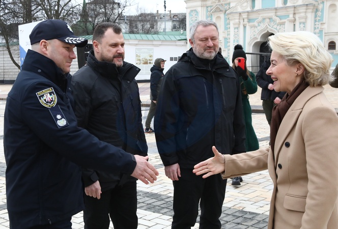 KYIV, UKRAINE - FEBRUARY 24, 2024 - President of the European Commission Ursula von der Leyen (R) meets head of the National Police of Ukraine Ivan Vyhivskyi, Minister of Internal Affairs of Ukraine Ihor Klymenko and Prosecutor General of Ukraine Andriy Kostin (L to R) in Sofiiska Square as part of the ceremony to convey combat cars to the front line, Kyiv, capital of Ukraine., Credit:Volodymyr Tarasov / Avalon