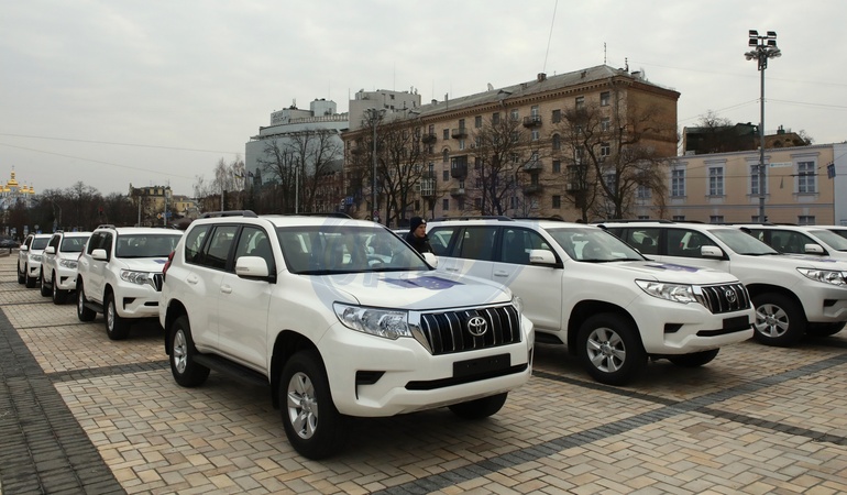 Ceremonia przekazania wozów bojowych na linię frontu odbywa się na placu Sofijskim w Kijowie, stolicy Ukrainy