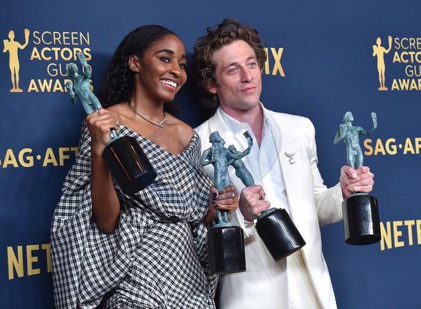 Ayo Edebiri and Jeremy Allen White in the press room at the 30th Annual SAG Awards at the Shrine Auditorium on February 24, 2024 in Los Angeles, CA.© OConnor-Arroyo/AFF-USA.com