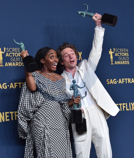 Ayo Edebiri and Jeremy Allen White in the press room at the 30th Annual SAG Awards at the Shrine Auditorium on February 24, 2024 in Los Angeles, CA.© OConnor-Arroyo/AFF-USA.com