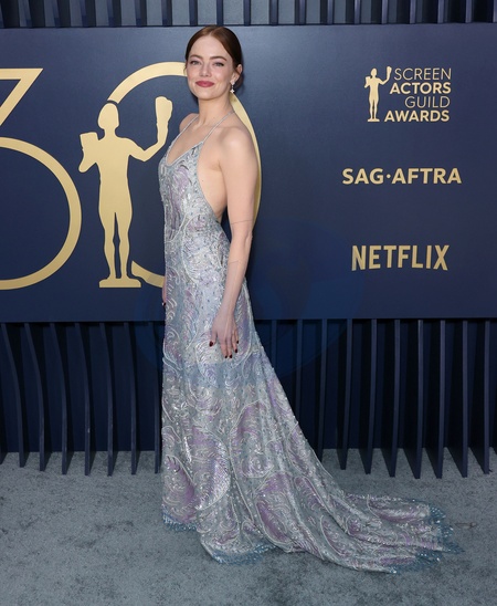 LOS ANGELES, CALIFORNIA, USA - FEBRUARY 24: Emma Stone wearing a Louis Vuitton metallic lace slip gown, embroidered with sequins, pearls and crystals fern leaf pattern and ivory sandals with Louis Vuitton High Jewelry arrives at the 30th Annual Screen Actors Guild Awards held at the Shrine Auditorium and Expo Hall on February 24, 2024 in Los Angeles, California, United States., Credit:Xavier Collin / Avalon