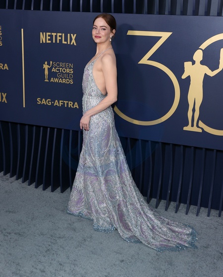 LOS ANGELES, CALIFORNIA, USA - FEBRUARY 24: Emma Stone wearing a Louis Vuitton metallic lace slip gown, embroidered with sequins, pearls and crystals fern leaf pattern and ivory sandals with Louis Vuitton High Jewelry arrives at the 30th Annual Screen Actors Guild Awards held at the Shrine Auditorium and Expo Hall on February 24, 2024 in Los Angeles, California, United States., Credit:Xavier Collin / Avalon