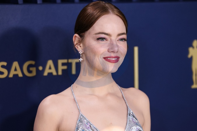 LOS ANGELES, CALIFORNIA, USA - FEBRUARY 24: Emma Stone wearing a Louis Vuitton metallic lace slip gown, embroidered with sequins, pearls and crystals fern leaf pattern and ivory sandals with Louis Vuitton High Jewelry arrives at the 30th Annual Screen Actors Guild Awards held at the Shrine Auditorium and Expo Hall on February 24, 2024 in Los Angeles, California, United States., Credit:Xavier Collin / Avalon