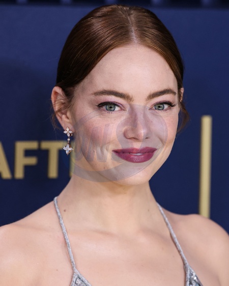 LOS ANGELES, CALIFORNIA, USA - FEBRUARY 24: Emma Stone wearing a Louis Vuitton metallic lace slip gown, embroidered with sequins, pearls and crystals fern leaf pattern and ivory sandals with Louis Vuitton High Jewelry arrives at the 30th Annual Screen Actors Guild Awards held at the Shrine Auditorium and Expo Hall on February 24, 2024 in Los Angeles, California, United States., Credit:Xavier Collin / Avalon