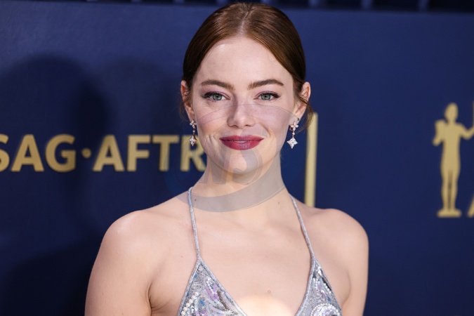 LOS ANGELES, CALIFORNIA, USA - FEBRUARY 24: Emma Stone wearing a Louis Vuitton metallic lace slip gown, embroidered with sequins, pearls and crystals fern leaf pattern and ivory sandals with Louis Vuitton High Jewelry arrives at the 30th Annual Screen Actors Guild Awards held at the Shrine Auditorium and Expo Hall on February 24, 2024 in Los Angeles, California, United States., Credit:Xavier Collin / Avalon