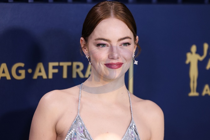 LOS ANGELES, CALIFORNIA, USA - FEBRUARY 24: Emma Stone wearing a Louis Vuitton metallic lace slip gown, embroidered with sequins, pearls and crystals fern leaf pattern and ivory sandals with Louis Vuitton High Jewelry arrives at the 30th Annual Screen Actors Guild Awards held at the Shrine Auditorium and Expo Hall on February 24, 2024 in Los Angeles, California, United States., Credit:Xavier Collin / Avalon