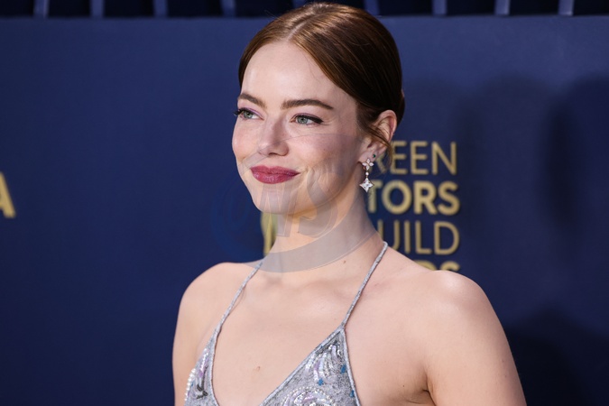 LOS ANGELES, CALIFORNIA, USA - FEBRUARY 24: Emma Stone wearing a Louis Vuitton metallic lace slip gown, embroidered with sequins, pearls and crystals fern leaf pattern and ivory sandals with Louis Vuitton High Jewelry arrives at the 30th Annual Screen Actors Guild Awards held at the Shrine Auditorium and Expo Hall on February 24, 2024 in Los Angeles, California, United States., Credit:Xavier Collin / Avalon