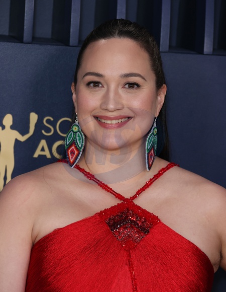 LOS ANGELES, CALIFORNIA, USA - FEBRUARY 24: Lily Gladstone wearing a Louis Vuitton metallic lace slip gown, embroidered with sequins, pearls and crystals fern leaf pattern and ivory sandals with Louis Vuitton High Jewelry arrives at the 30th Annual Screen Actors Guild Awards held at the Shrine Auditorium and Expo Hall on February 24, 2024 in Los Angeles, California, United States., Credit:Xavier Collin / Avalon