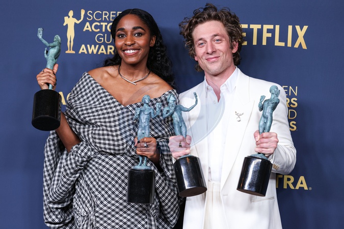 LOS ANGELES, CALIFORNIA, USA - FEBRUARY 24: Ayo Edebiri and Jeremy Allen White, winners of the Outstanding Performance by a Female and Male Actor in a Comedy Series and Outstanding Performance by an Ensemble in a Comedy Series awards for 'The Bear' pose in the press room at the 30th Annual Screen Actors Guild Awards held at the Shrine Auditorium and Expo Hall on February 24, 2024 in Los Angeles, California, United States., Credit:Xavier Collin / Avalon