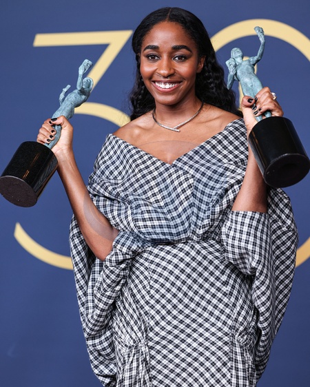 LOS ANGELES, CALIFORNIA, USA - FEBRUARY 24: Ayo Edebiri, winner of the Outstanding Performance by a Female Actor in a Comedy Series and Outstanding Performance by an Ensemble in a Comedy Series awards for 'The Bear' poses in the press room at the 30th Annual Screen Actors Guild Awards held at the Shrine Auditorium and Expo Hall on February 24, 2024 in Los Angeles, California, United States., Credit:Xavier Collin / Avalon